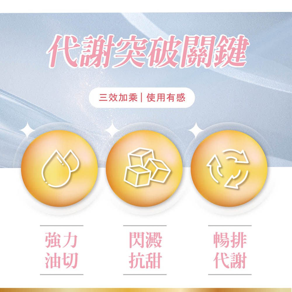 成分:幾丁聚糖(幾丁聚糖、丁二酸)、難消化生麥芽糊精、維生素C、白腎豆萃取物、望江南萃取物、栗子種皮萃取物、二氧化矽、秋葵粉(秋葵、菊糖、檸檬酸)、山茶花萃取物(山茶花萃取物、麥芽糊精)、吡啶甲酸鉻