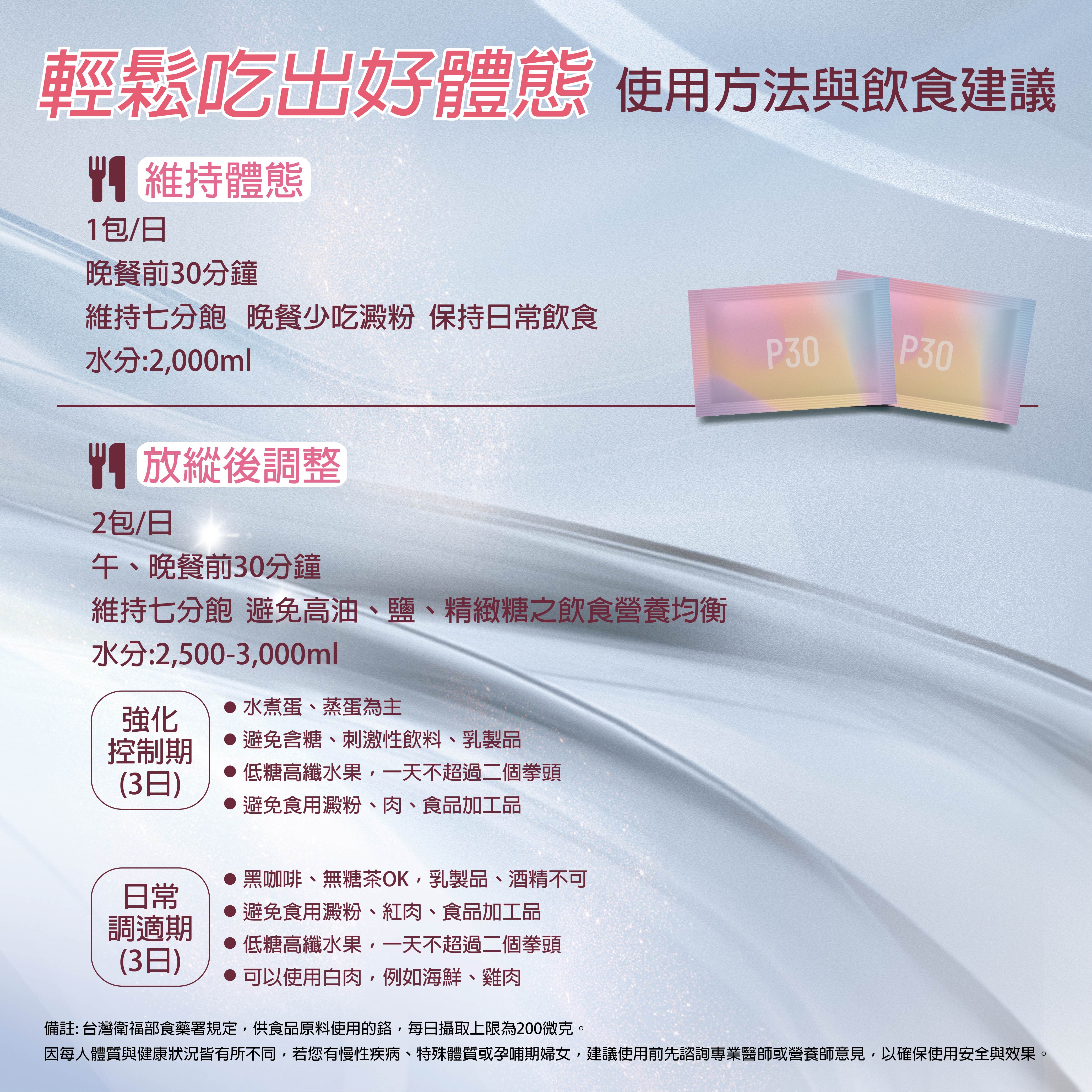 注意事項:有服用慢性病藥物者,應諮詢醫師後,方可使用。不建議孕婦、授乳者及婴幼兒食用。